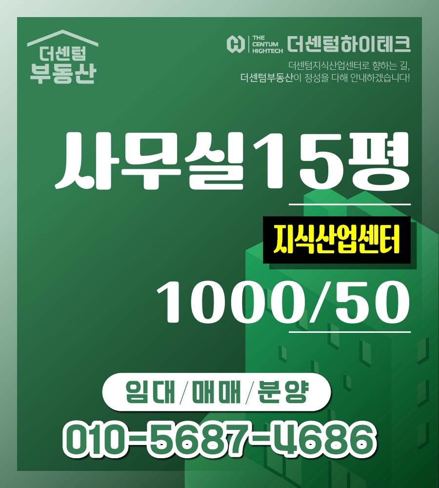 더센텀하이테크(지식산업센터)사무실 · 시스템에어컨 완비/테라스 서비스 면적/주변카페거리 인접 · 15평 (약 49.59 ㎡) · 임대1000 / 50 / 매매